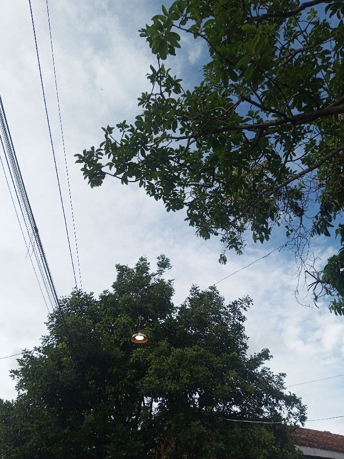 Looking up, the scene reveals two trees with vibrant green leaves set against a backdrop of a cloudy blue sky. Power lines crisscross the upper left, adding a stark contrast to the natural scenery. One tree obscures a warm-toned street light, while glimpses of a red roof peek through the lower right, suggesting an urban environment blended with nature.