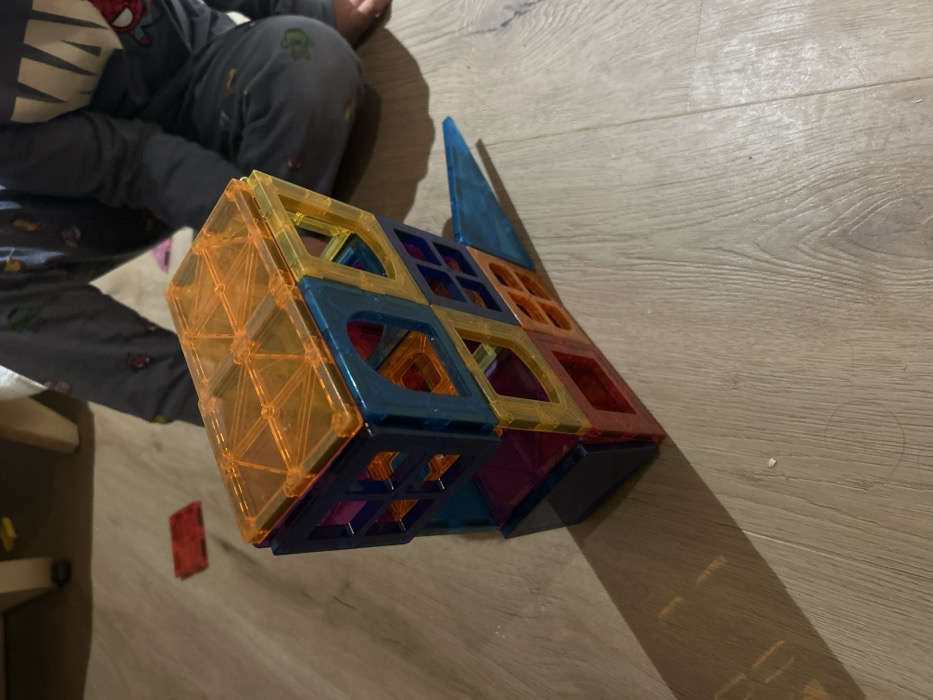 n indoor setting with a multi-story structure built from translucent magnetic tiles, resting on a light-colored wooden plank floor