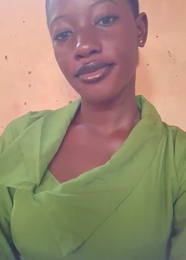 A young woman with short dark hair is looking directly at the camera. She is wearing a green top. She raises her hand to her chin. The background is a peach-colored wall. There is indistinct audio in the background.