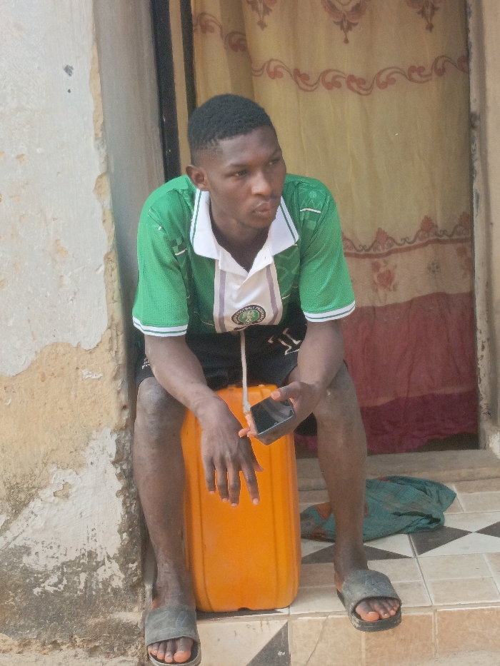 A young adult male, with dark skin and short dark hair, is seated on an orange plastic jerrycan (approximately 20-25 liters capacity) in a doorway area within the city of Keffi, Nigeria