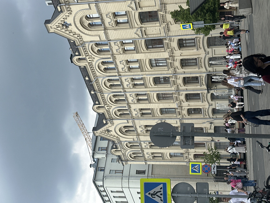 street scene in Moskva, Russia, at the coordinates 55.754 latitude and 37.627 longitude. The scene is dominated by a large, classic, yellow-colored building with many windows, and some ornate detailing. It has a flat roof and appears to have been built in the late 19th or early 20th century. There is a construction crane in the background. In the foreground are numerous pedestrians walking along the street. Some are wearing casual clothing while others are wearing more formal attire. There are several street signs, including a crosswalk sign, and a few fountains in front of the building. The scene is bustling with activity, with people moving through the streets, likely tourists, locals, and workers, and there are many trees and plants in the background. There is an overcast sky above the city, but it is not raining. The scene appears to be in the center of the city, likely on a main road, based on the size and type of building and the traffic.