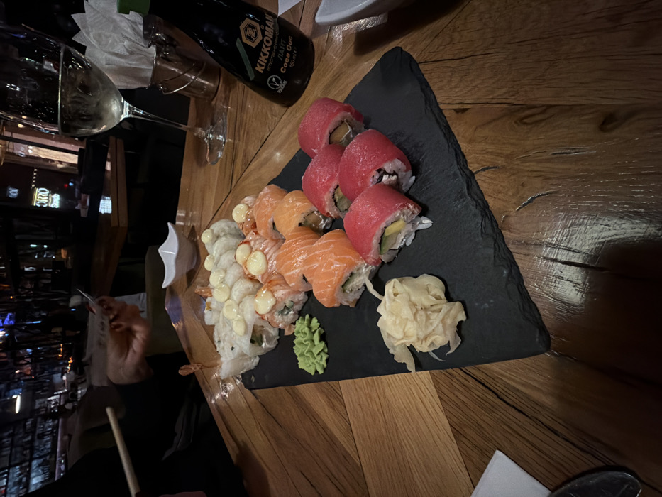 The image captures an indoor dining scene at Orlo Club & Bar in Plovdiv, Bulgaria. The foreground features a polished wooden table exhibiting a diagonal plank pattern. Dominating the center is a black rectangular slate serving board displaying approximately 30 pieces of sushi. The sushi rolls are arranged in rows: eight white-wrapped rolls topped with a creamy white substance, eight salmon-wrapped rolls similarly topped, and six red-wrapped rolls revealing green internal fillings. To the left on the slate, a portion of green wasabi paste and a pile of pickled ginger are present. To the right of the sushi board, a stemmed glass containing white wine shows condensation on its surface. Adjacent to the wine glass is a dark 150ml Kikkoman soy sauce bottle, labeled "Лайт Соев Сос" (Light Soy Sauce) and "Vegan". A small white, triangular-shaped dish and a metallic bucket holding a crumpled white napkin are also positioned on the table. In the upper-left quadrant, a person's left hand holds wooden chopsticks, and their right hand grasps a small white rectangular object. The individual is wearing dark clothing. The background is dimly lit, revealing a bar area with shelves stocked with bottles and a neon sign partially visible, displaying the letters "ORLO".