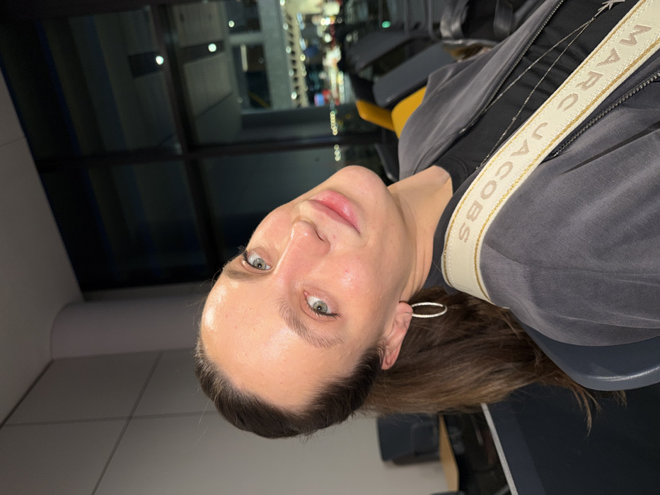 A fair-skinned woman with light eyes and brown hair pulled back into a ponytail poses indoors. She's wearing silver hoop earrings, a black top, and a gray jacket with a beige Marc Jacobs strap. Background details include a tiled wall, a window reflecting city lights at night, and chairs, suggesting a public space like an airport lounge. The photo is slightly tilted to the left.