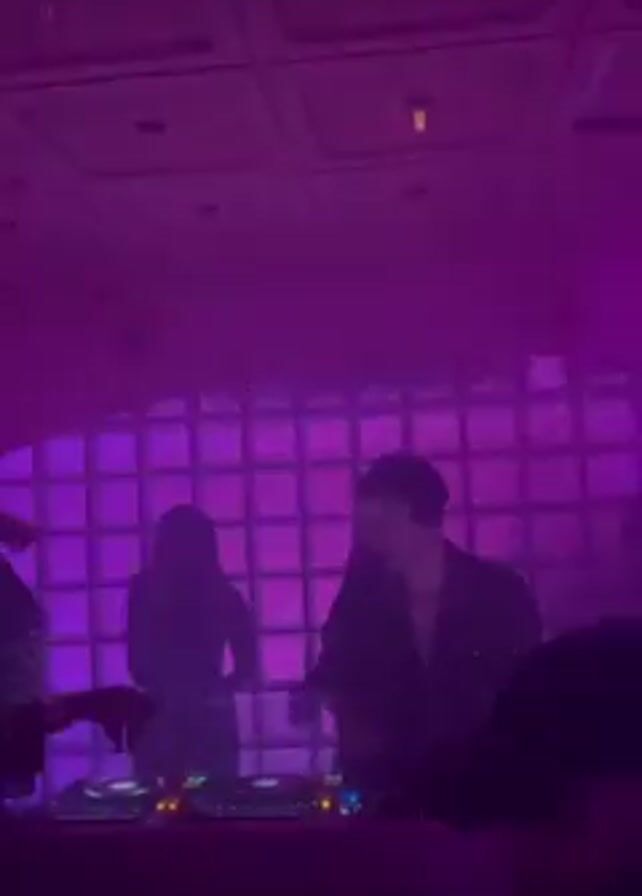 In a dark, club-like setting illuminated by pink and purple lighting, a DJ stands behind a DJ console. The DJ, dressed in what appears to be a black blazer and dark glasses, is the central figure, operating the equipment. Two additional figures are visible, standing to the left and right of the DJ. A light-colored wall with a pattern of squares forms the backdrop. The video has slight camera shake.