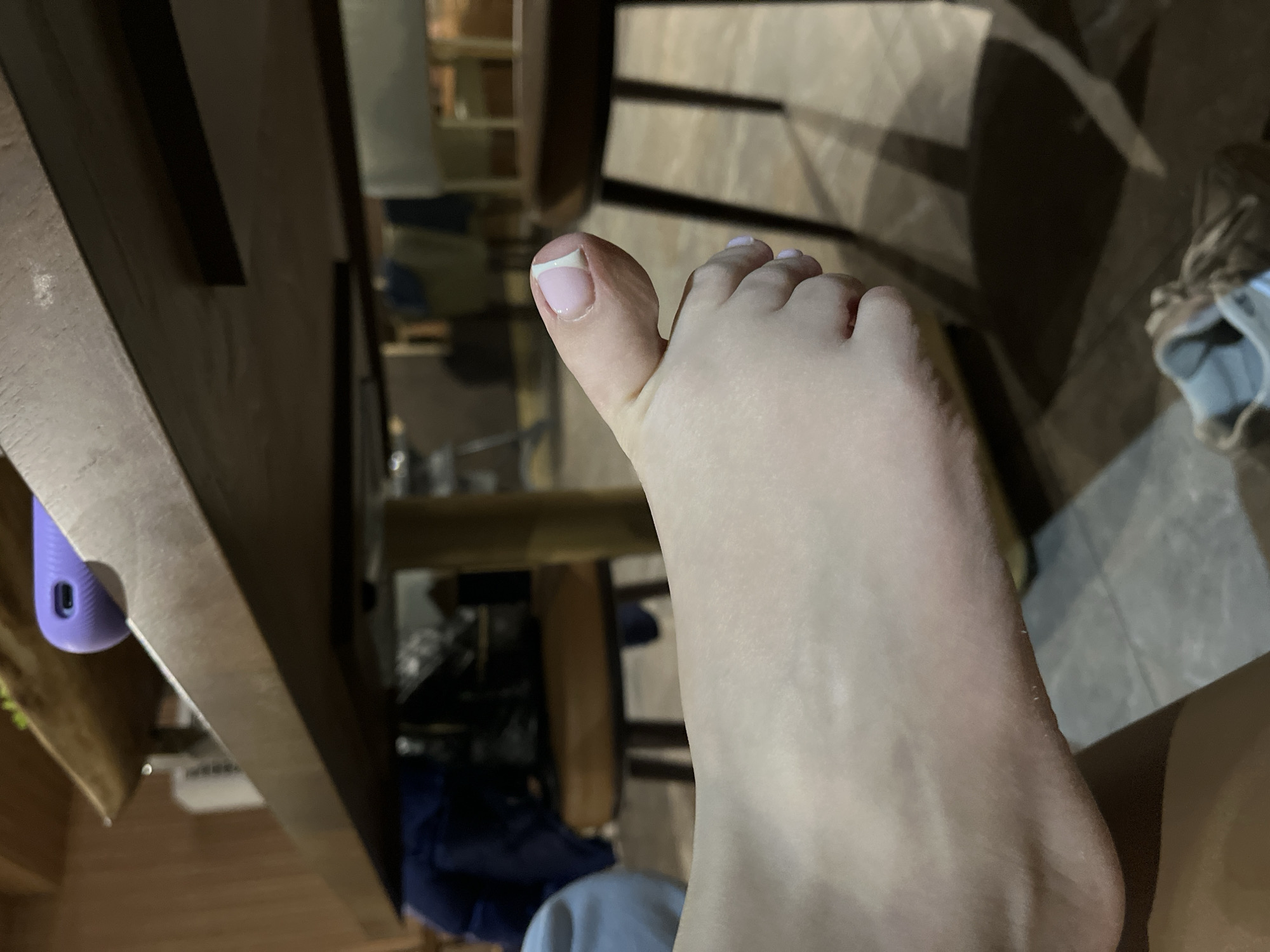 The image depicts an indoor scene, likely within a cafe or restaurant setting. While the precise location within Shumen, Bulgaria, cannot be definitively identified from the visual information, the environment suggests a commercial establishment. The primary subject is a person's bare left foot, positioned in the lower-left to mid-right foreground. The foot exhibits light-toned skin, and the toenails are meticulously groomed with a French manicure style (pink base with white tips). The foot is situated beneath a substantial dark-stained wooden table that occupies the upper portion of the frame. On the table's surface, a purple smartphone case, featuring a visible USB-C charging port, is partially discernible in the upper-center. The background elements are largely out of focus. Visible elements include legs of dark wooden chairs on the right, and what appears to be a light brown, possibly leather, stool-like chair under the table on the left. A folded dark blue garment is indistinctly visible in the blurred background under the table. On the floor in the lower-right, a light-colored shoe, possibly a sneaker, with brown accents is partially visible. The flooring consists of large rectangular tiles, appearing in shades of grey or brown, with shadows cast across them, indicating artificial interior lighting.