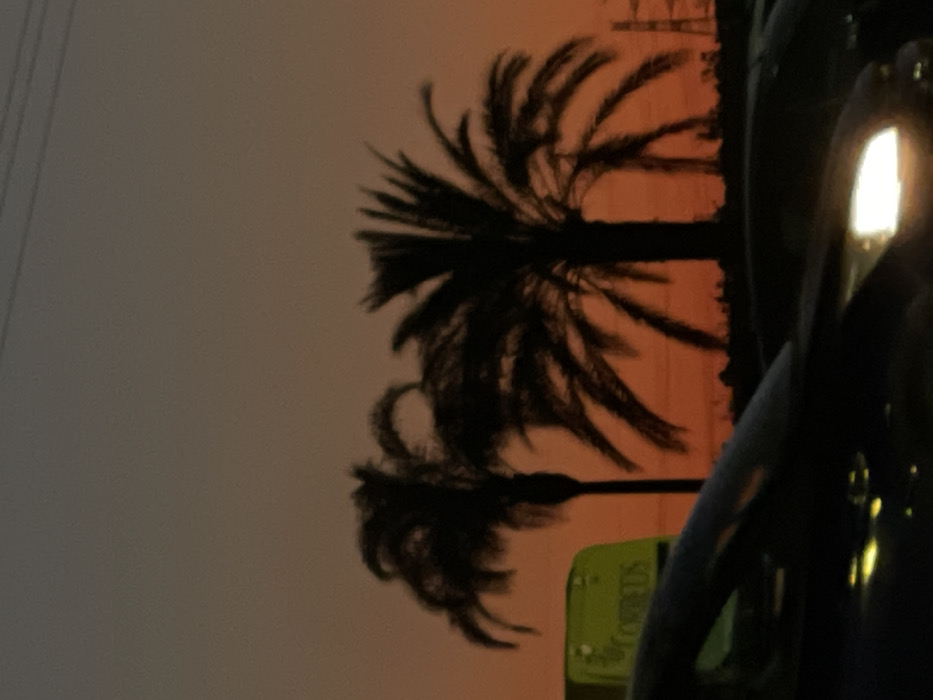 The image depicts an outdoor scene in Paiporta, Spain, at sunset or dusk. The sky transitions from a deep orange-red near the horizon to a muted grey-blue at the top. Two palm trees are silhouetted against the vibrant lower sky, with a larger, more distinct palm on the right and a smaller one to its left. In the mid-ground, power lines are visible stretching horizontally across the upper sky. A tall, angular metal structure, likely a power transmission tower, is faintly visible in silhouette on the far right horizon. In the foreground, the hood and illuminated headlight of a dark-colored vehicle are prominent on the right. To the left of this vehicle, a portion of a yellow utility or delivery vehicle is visible, bearing the partially legible word "CORREOS" in green lettering. Other dark vehicles are indistinctly parked in the lower right portion of the image. No individuals are discernible.