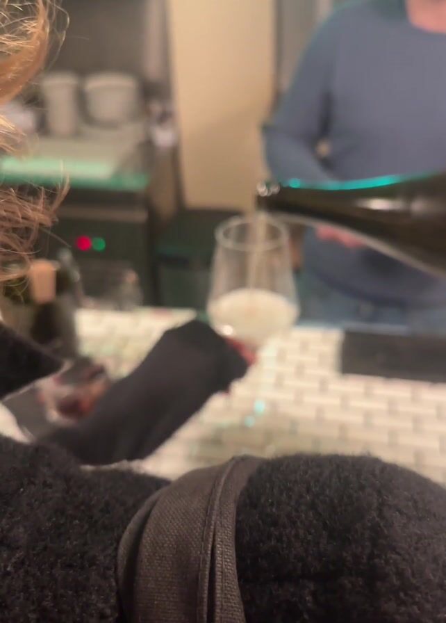Here is a detailed description of the video: The video shows a first-person perspective from someone wearing a black jacket with a strap across the chest. The person is at a bar where a bartender is pouring sparkling wine from a large bottle into a stemmed glass. The bar has a black and white tile countertop. The bartender, a man with a beard wearing a blue long-sleeved shirt and jeans, holds the bottle at an angle to pour the liquid. In the background, behind the bartender, are beer taps, a trash can, and a metal shelving unit with plates and other kitchen items. A small bowl with olives is visible to the left of the glass. The audio picks up music, cheering, and general background noise.