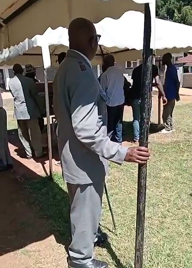 The video depicts a man in a gray suit and glasses standing beneath a white tent. He is holding a metal tent pole. Other people are gathered nearby, some under the tent and others walking on the grass. A building and trees are visible in the background under a clear blue sky. The scene suggests an outdoor event or gathering taking place on a sunny day.