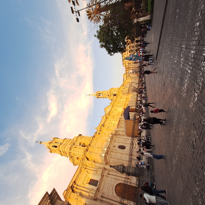 A wide shot captures a large, ornate cathedral in warm sunlight. The building features multiple towers and intricate architectural details. A crowd of people mills about on a cobblestone plaza in front of the structure. Trees and lamp posts line the edge of the plaza. The sky above is a mix of blue and pale pink clouds.