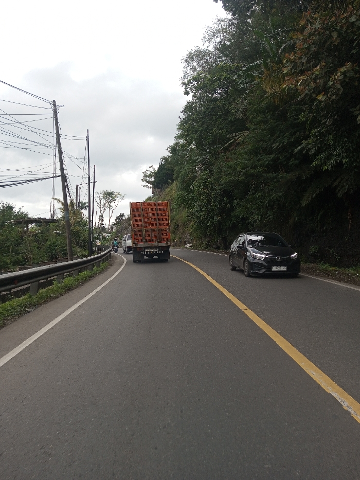 The image depicts a two-lane asphalt road in Gubbisamamidi, India, under an overcast sky. The road features a continuous yellow centerline and a white solid line marking the left shoulder. A black metal guardrail runs along the left side of the road, behind which dense green vegetation and several utility poles with numerous overhead wires are visible. To the right, a steep, heavily vegetated hillside borders the road. A medium-duty flatbed truck, loaded with numerous orange plastic crates, travels away from the viewer in the left lane. Behind the truck, a person operates a light-colored motorcycle. On the right shoulder, a black four-door sedan, identified by the license plate 'F 1373 ZJ', is stationary or moving slowly, angled towards the viewer with its headlights illuminated.