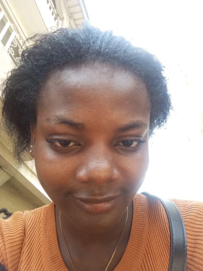 A close-up, high-angle portrait shot depicts a female individual with dark skin, dark curly hair, and dark eyes, looking downward with a slight smile. She wears a ribbed, burnt orange top, small gold stud earrings, and a thin gold chain necklace. A black bag strap is visible on her right shoulder. The background is overexposed white, with a partial view of a light-colored building featuring a window and white decorative grilles on the left. The scene is situated in Agburu Uke, Nigeria.