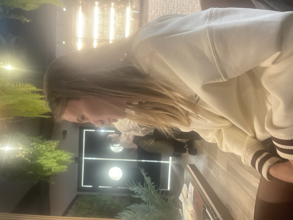 A woman with blonde hair wears a white sweatshirt. She is angled to the side, her head bent down. Reflected in the background is another person wearing white. A door with rectangular lights is behind them. Green plants surround the door. A table with decorative items is in the foreground.