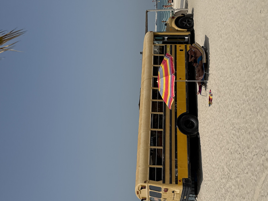 This image captures a beach scene in Dubai, United Arab Emirates. The foreground consists of light-colored sand under a clear, light blue sky. A large, weathered yellow American-style school bus, featuring black trim and multiple windows, is parked horizontally on the sand, facing towards the right side of the frame. Its front passenger door is open. In front of the bus, a multi-colored striped beach umbrella, displaying red, orange, yellow, green, and pink hues, shades two reclining beach chairs. A male individual is visible lying on the beach chair closer to the camera, wearing blue swim trunks and sunglasses, with his hands placed behind his head. A second individual is partially visible reclining on the adjacent beach chair. A small, colorful piece of fabric or a towel rests on the sand near the chairs. In the mid-ground, the blue ocean is visible with white demarcation ropes or buoys near the shoreline. Distant large vessels or industrial structures are present on the water near the horizon. A fragment of a palm frond is visible in the upper right corner of the frame.
