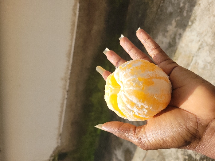 - "The image displays a dark-skinned human hand holding a partially peeled citrus fruit, identified as an orange or tangerine, in Takau, Nigeria" by FM-ZlnEa2, licensed under CC BY 4.0