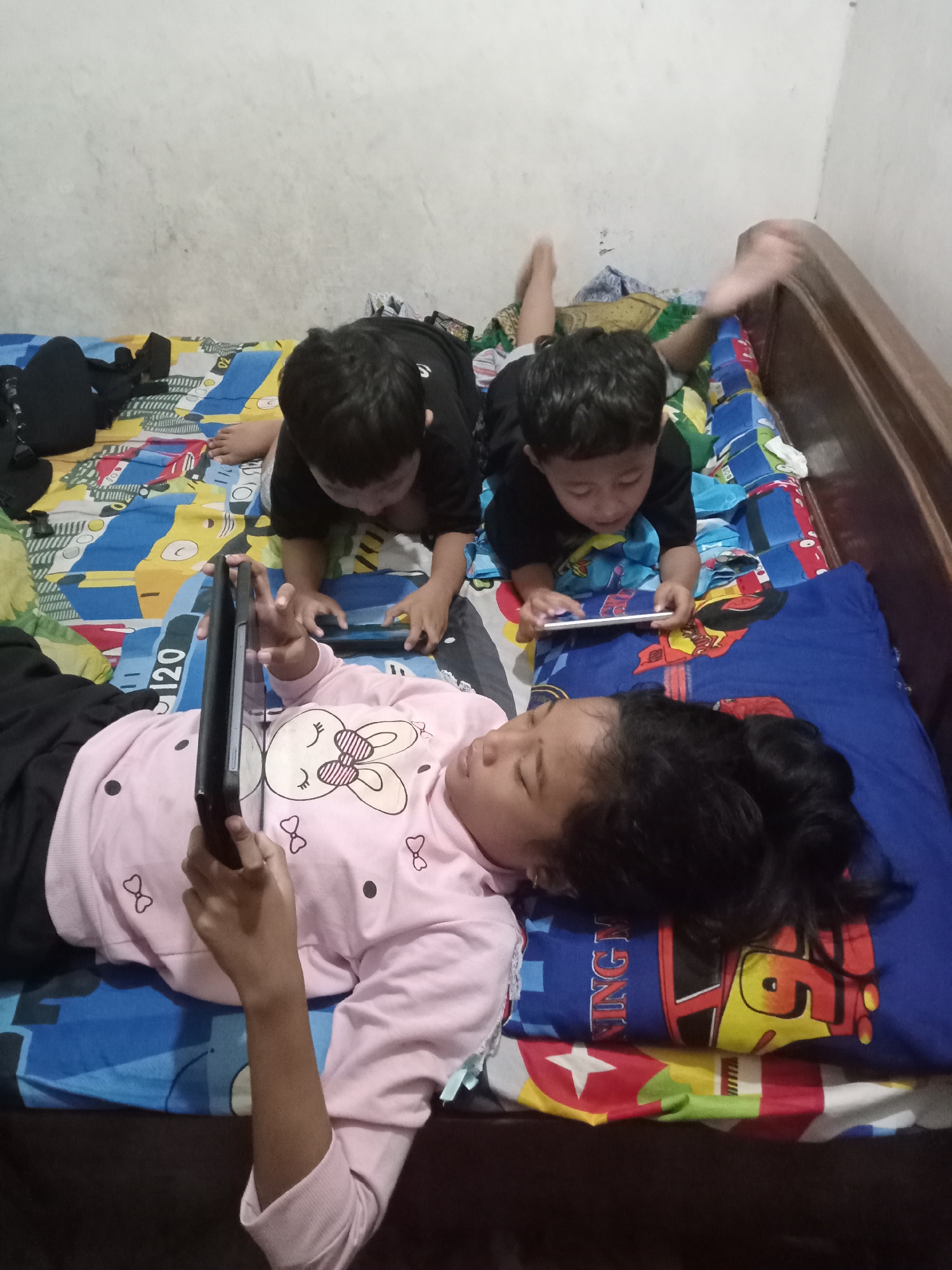 In a room located in Bungur, Indonesia, three individuals are situated on a bed. One female, appearing to be a young adult or teenager with dark hair, lies supine on a multi-colored patterned sheet depicting vehicles. She wears a pink long-sleeved shirt with a rabbit graphic and is holding a black tablet with both hands, viewing its screen. To her right, two male children lie prone on the same bedsheet. The male closer to the female wears a black t-shirt and manipulates a white smartphone with both hands. The second male, further right, also wears a black t-shirt and holds a white smartphone with both hands, looking at its screen. A blue pillow with red and yellow graphics is positioned beneath the female's head. Scattered clothing items, including black fabric, are visible on the bed to the left of the female. A plain, light-colored wall forms the background, and a brown wooden bed frame component is visible along the right edge of the bed. All three individuals are engaged with their respective electronic devices.