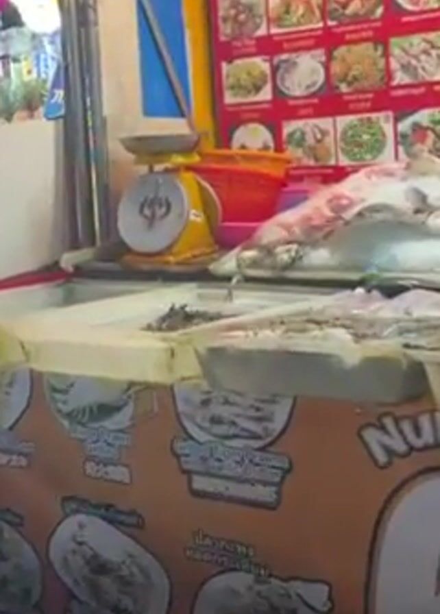 street food vendor's stall, identified as "Number 6" by a large sign. The stall displays various menu items on a red sign, and below it, are promotional images of dishes. A yellow scale sits on the counter. In a white basin filled with icy water, there is a crocodile or alligator head, likely for use in a dish. A person walks in front of the stall briefly.