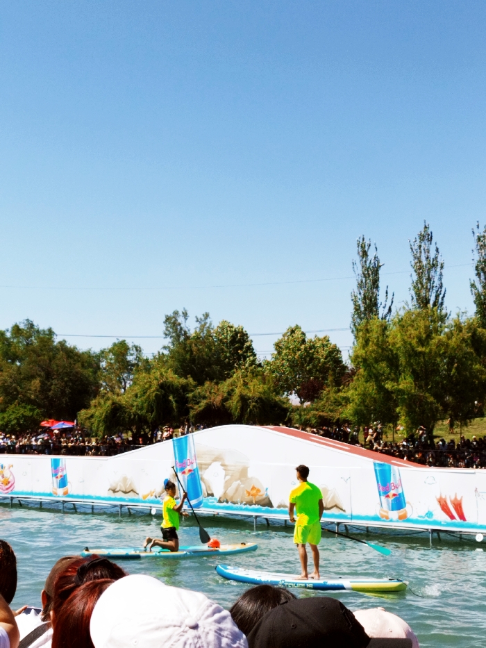 Two people in bright green outfits paddleboard on water, facing away from the viewer. A white backdrop with a red stripe runs behind them, adorned with blue Red Bull can designs. A crowd watches from behind the backdrop, with trees visible in the background. The sky is clear blue. Many viewers are visible in the foreground.