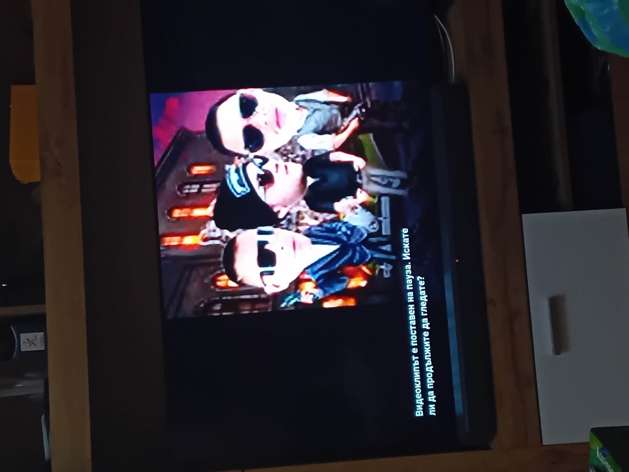 television screen displaying three cartoonish figures wearing sunglasses. The background appears to be an urban scene. Text is overlaid on the screen in Bulgarian, which translates to "The video clip is paused. Do you want to continue watching?" The television is situated within a wooden frame or shelving unit. A white cabinet is visible to the right of the television. The location of Provadia, Bulgaria, is not indicated or suggested within the visible scene.