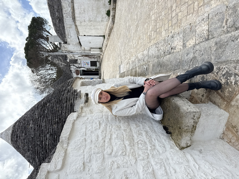 - "An adult female is seated on a stone bench within a cobblestone street in Alberobello, Italy" by FM-4ESV13, licensed under CC BY 4.0