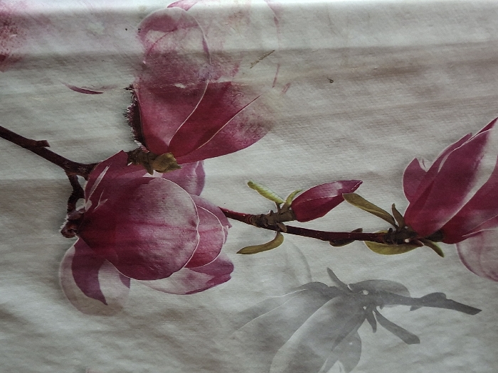 This image presents a close-up, top-down view of a textured, off-white surface, displaying a printed floral pattern. The pattern features a branch with multiple deep pink and magenta magnolia flowers, depicted in various stages of bloom and as unopened buds. The flowers show lighter pink and white color variations on their petals, suggesting depth. The branch itself is thin and brown. Faint, translucent grey outlines or impressions of additional floral elements are visible in the background, particularly in the lower-right quadrant. The underlying surface exhibits minor irregularities consistent with fabric or paper, showing a slight fibrous texture. No individuals or active interactions are depicted. The scene captures a static decorative item located in the city of Selyanin, Bulgaria.