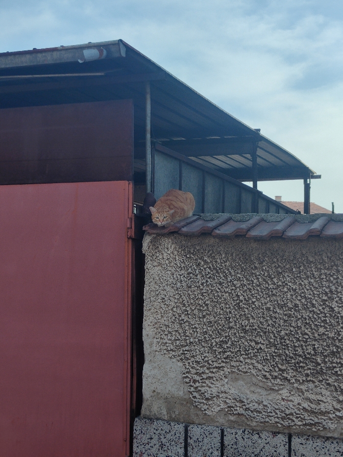 An orange tabby cat is observed crouching on a weathered, concrete or stucco wall capped with terracotta-colored roof tiles, in Chepintsi, Bulgaria. The cat faces forward, its front paws tucked, and its gaze directed towards the viewer. To the immediate left, a vertical, reddish-brown panel or door is visible, adjacent to the wall. Behind the wall and cat, a metallic-framed structure with a dark framework and a sloping, possibly translucent roof extends into the background. Further in the distance, a building with a reddish-orange tiled roof is partially visible. The sky overhead is overcast, displaying light blue-grey clouds.