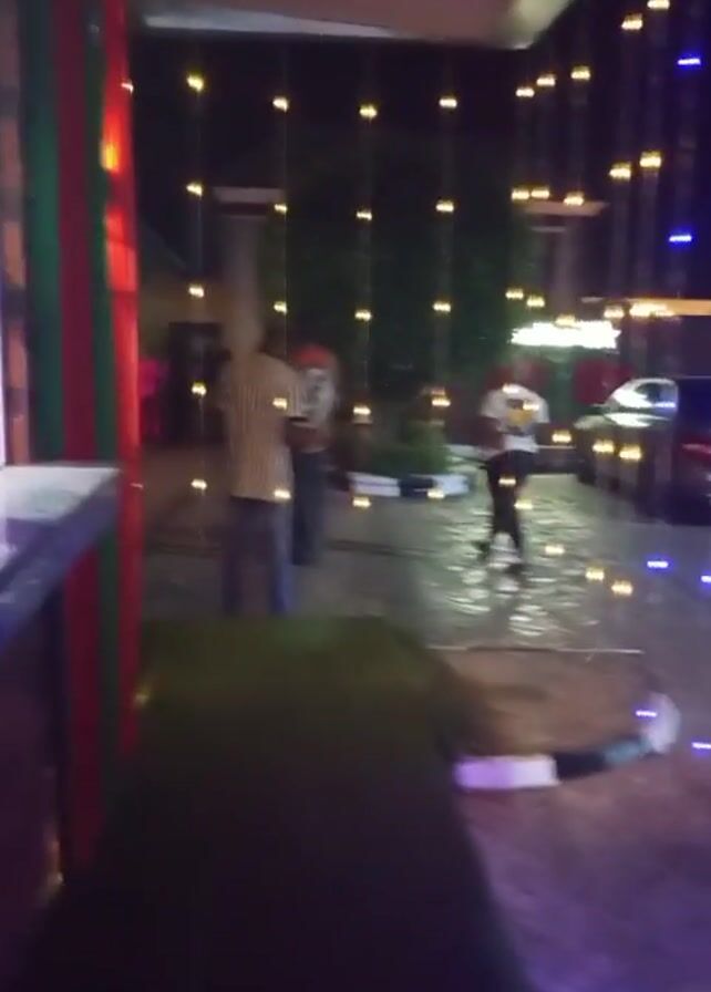 nighttime scene at what appears to be an outdoor event space or entrance area. There are several people milling about, some standing and conversing, others walking. The area is decorated with strings of lights, some yellow and some blue. In the background, a car is parked, and there's a structure with red and green stripes. A counter with a window reveals a small aquarium inside. A sign with writing is visible on the window, and a water bottle sits on the counter. The music is playing in the background. The camera moves slightly, offering different perspectives of the scene.