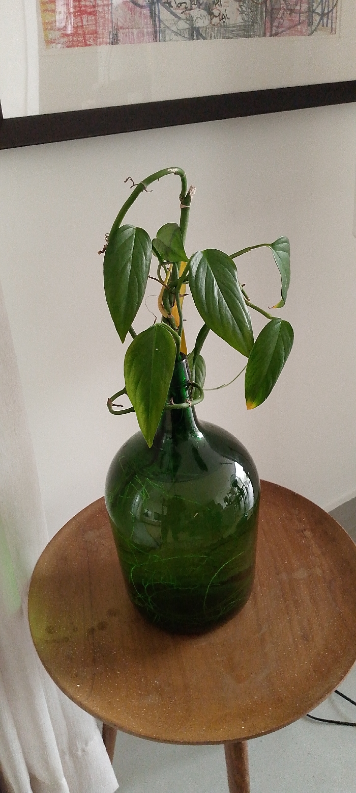 The image depicts an indoor scene located in Alaguntan, Nigeria. A vining plant with multiple oval, green leaves, some exhibiting minor marginal chlorosis at their tips, grows from a large, dark green glass bottle. The plant's stems are partially supported by a thin yellow rod. The bottle features a bulbous base with etched, light green, web-like patterns and a narrower neck. This assembly rests centrally on a circular, light-brown wooden table, the surface of which displays a fine layer of dust and minor abrasions. In the background, an off-white wall is visible, with a framed abstract artwork hanging above the plant. The artwork, partially obscured by reflection, contains red, yellow, and dark linear elements. A light-colored, vertically hanging curtain is partially visible on the left side of the frame. No individuals, direct actions, or interactions are present within the scene.