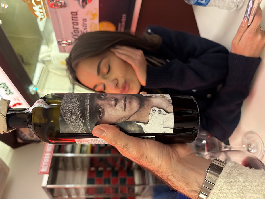 The scene depicts an indoor social setting, likely a casual restaurant or bar in the city of Seoul, South Korea. In the immediate foreground, a person's left forearm and hand, wearing a silver Casio wrist watch, hold a dark glass bottle vertically. The bottle features a label with a black-and-white portrait of a man in a flat cap and a light-colored shirt. Below the hand, two wine glasses containing red liquid rest on a white tabletop. In the midground, to the right, a young adult female with dark hair is seated, slightly out of focus. She is posing with her eyes closed and lips pursed in a kissing gesture, her right hand gently touching her cheek. She wears a dark, long-sleeved top with light-colored buttons. Her left hand rests on the table, holding a light-colored smartphone. A clear plastic bottle of Jeju Samdasoo mineral water is also visible on the table near her hand. The background includes a stainless steel shelving unit to the left, backed by a wall with a red and black checkered pattern. A partial red sign is visible, reading "RETURN HE...". To the right, a prominent illuminated "Corona Extra" sign with a golden crown logo and a red glow is displayed, with a fainter "Soda" sign positioned above it.
