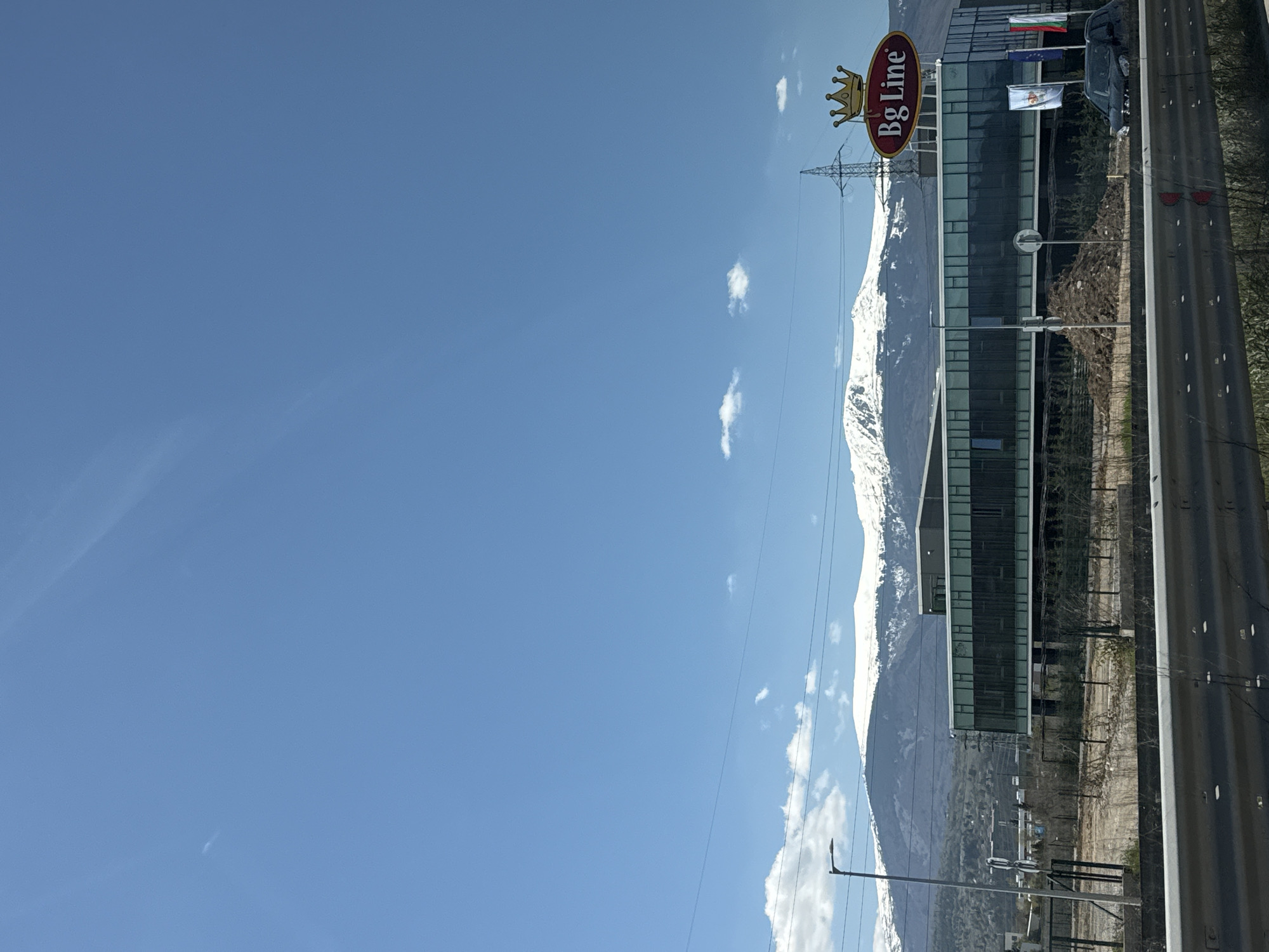 The image depicts a modern building with a "Bg Line" sign and a crown logo against a backdrop of a snow-capped mountain range and a clear blue sky. The flags of Bulgaria, Europe, and German are on display. The building sits near a highway with guardrails. The location is German, Bulgaria.