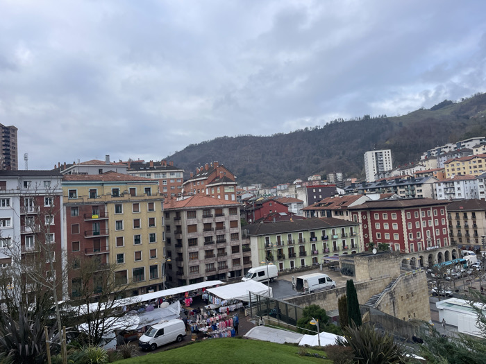 An elevated panoramic view of Eibar, Spain, depicts a cityscape under an overcast, gray sky. In the immediate foreground, a verdant grassy slope is visible. Below, an active outdoor market features numerous white canopy tents sheltering stalls displaying various goods, including textiles and other merchandise. Several white delivery vans are parked adjacent to the market area. Multiple pedestrians, identifiable as both vendors and customers, are present and interacting within the market space. To the right of the market, a multi-tiered, light-colored stone wall structure with visible staircases leads to a plaza area containing parked vehicles. The mid-ground is dominated by dense urban architecture, consisting of numerous multi-story residential and commercial buildings. These structures exhibit diverse facades in colors such as beige, red, yellow, light green, and white, many featuring balconies. A prominent red building with ground-level arcades is visible to the right of the market. In the background, steep, heavily wooded hills rise, forming a natural boundary for the city. Scattered residential buildings are discernible on the lower slopes of these hills. A taller, modern white high-rise building stands out against the distant hillside.