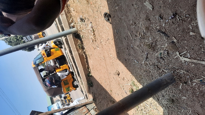 The image depicts a daytime scene in Panshekara, Nigeria, observed from a low vantage point beside a paved road. The foreground consists of dry, reddish-brown dirt littered with wood splinters, small sticks, plastic debris, and a dark, unidentified small object resembling a bird carcass. A dark metal pole is visible in the lower-left. A large, angular shadow extends across the dirt from the left. In the midground, a yellow auto-rickshaw, commonly known as a "Keke Napep," with a brown canopy, travels on a paved road from left to right. The vehicle displays the registration "KML 0972" on its rear side and "KAWA" on its front fender. It carries at least three passengers: one in white clothing with a dark backpack is positioned towards the rear, and two others in light-colored attire are further inside. Another grey utility pole stands vertically on the right side of the road. A concrete curb separates the dirt ground from the roadway. The background reveals a clear, light blue sky. Beyond the road, additional Keke Napeps are visible further down the street, indicating ongoing traffic. Buildings line the left side of the street, one featuring a billboard with blue and white elements. Trees and other foliage are present in the distance on the right. A person's dark-skinned shoulder and upper arm, wearing a garment with a red band, are partially visible in the upper-right foreground, suggesting the perspective of the photographer or a nearby individual.