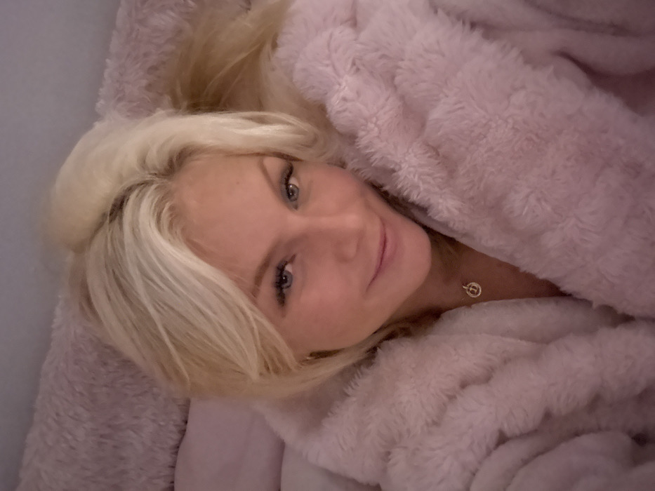 A blonde woman lies in bed, nestled under a fluffy, pink blanket. Her blue eyes meet the camera with a slight smile. The light is soft, creating a warm, cozy atmosphere. She wears a delicate necklace, adding a touch of elegance to the relaxed scene. The angle is slightly overhead, giving a glimpse of the soft bedding and the plush blanket.