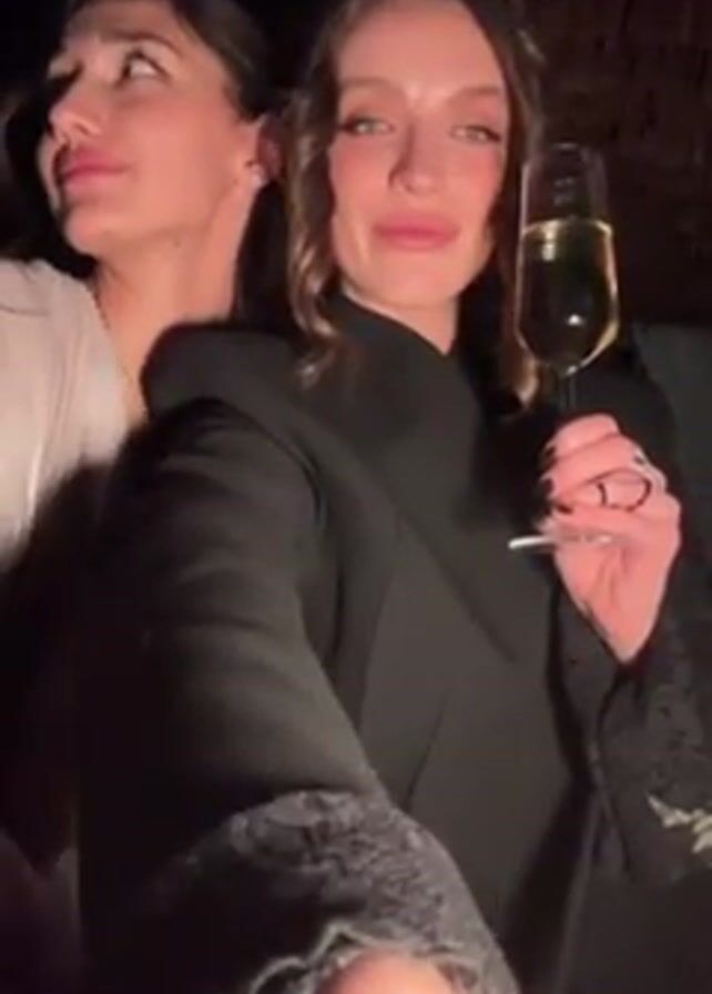 Two young women are in a dimly lit setting. The woman in the foreground is holding a wine glass filled with a light-colored liquid, possibly champagne. She wears a black blazer with lace sleeves and several rings. Her hair is styled with loose waves. The woman in the background, slightly out of focus, has dark hair pulled back and wears a light-colored top. She is smiling. The foreground woman's facial expression changes as if she's laughing. The environment appears to be outdoors, possibly at an event or gathering. The background is dark.