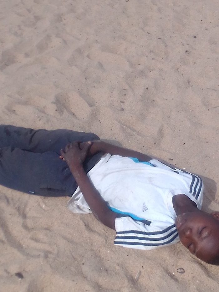 A male individual with dark skin is positioned supine on a light brown sandy surface in Ajaokuta, Nigeria