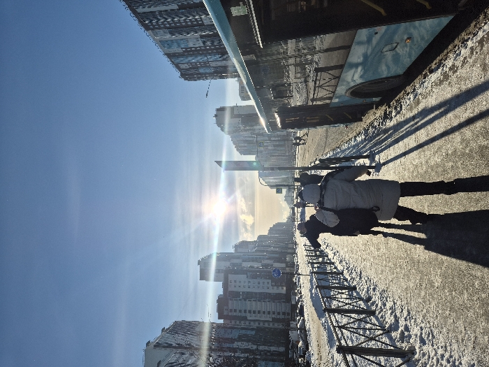 The image depicts a winter street scene in a modern residential district of Saint Petersburg, Russia, likely along Komendantsky Prospekt in the Primorsky District. The weather is clear and sunny, with a low sun causing significant lens flare directly ahead and casting long, distinct shadows from people and objects across the foreground. In the immediate foreground, a light-blue public transit bus, consistent with a LiAZ-5292 model common in Saint Petersburg, is stopped on the right side, with its front and middle doors open, indicating a bus stop. To the left of the bus, a partially cleared, paved sidewalk runs parallel to the street, covered in patches of snow and ice. A black metal fence separates this sidewalk from a snow-covered roadway or parking area on the left. Three individuals are visible walking away from the camera on the sidewalk. The closest person wears a light-colored winter coat and dark pants, carrying a dark bag over their left shoulder. Their long shadow extends diagonally towards the viewer. Behind them, a second person in a dark winter coat also casts a long shadow. A third, partially obscured person is visible further down the sidewalk. The background features a wide, snow-covered street lined with numerous modern, multi-story residential buildings on both sides. These buildings display varied architectural designs, including facades with contrasting panels (e.g., reddish-brown and light sections on the left, dark and light patterns on the right). A distinct, tall, angular building with a pointed top is visible in the far distance, slightly right of the center, partially obscured by the intense sun glare. Streetlights and a circular blue traffic sign are visible along the left side of the street, with more pedestrians visible further down the road.