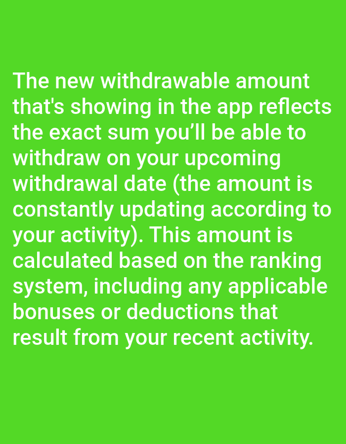 The text on a green background explains that the withdrawable amount shown in the app reflects the exact sum available on the upcoming withdrawal date. This amount is constantly updated based on user activity. The calculation considers the ranking system and includes any applicable bonuses or deductions resulting from recent activity.