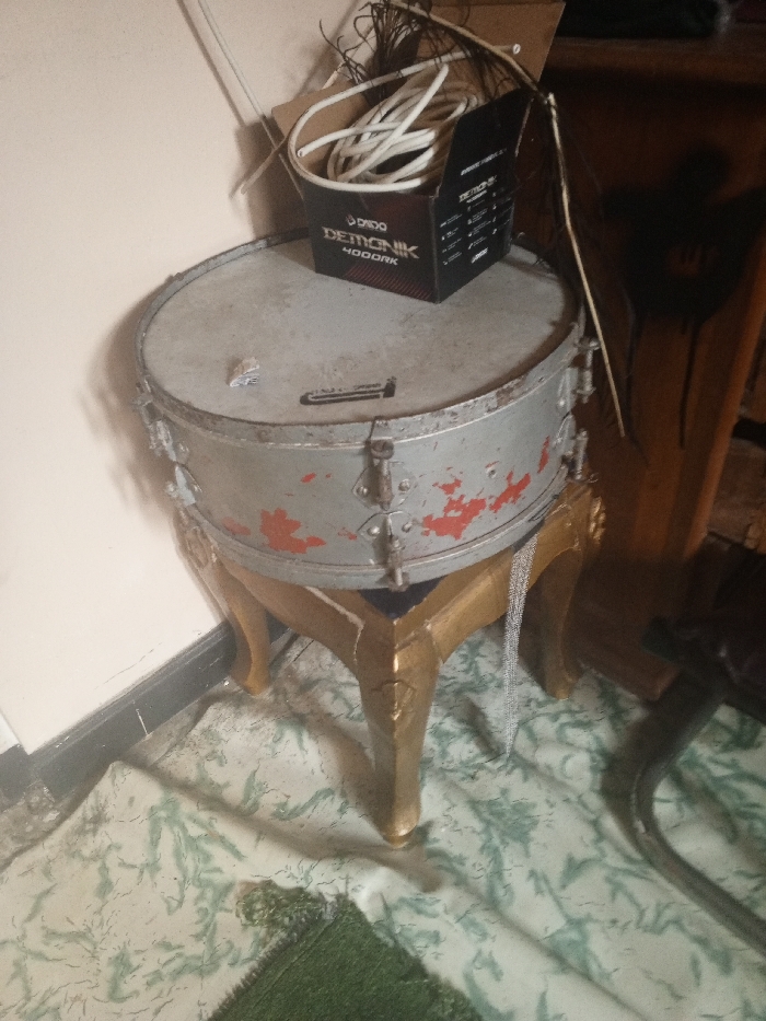 An old silver-colored drum sits atop a golden three-legged stand. Red paint is chipped off the drum's surface. A box labeled "DEMONIK 4000RK" rests on the drumhead, partially obscuring it. White cables and wires are piled behind the box and spill out of a cardboard box. The drum stand sits on a patterned green and white surface. A dark wooden cabinet is partially visible in the background on the right.