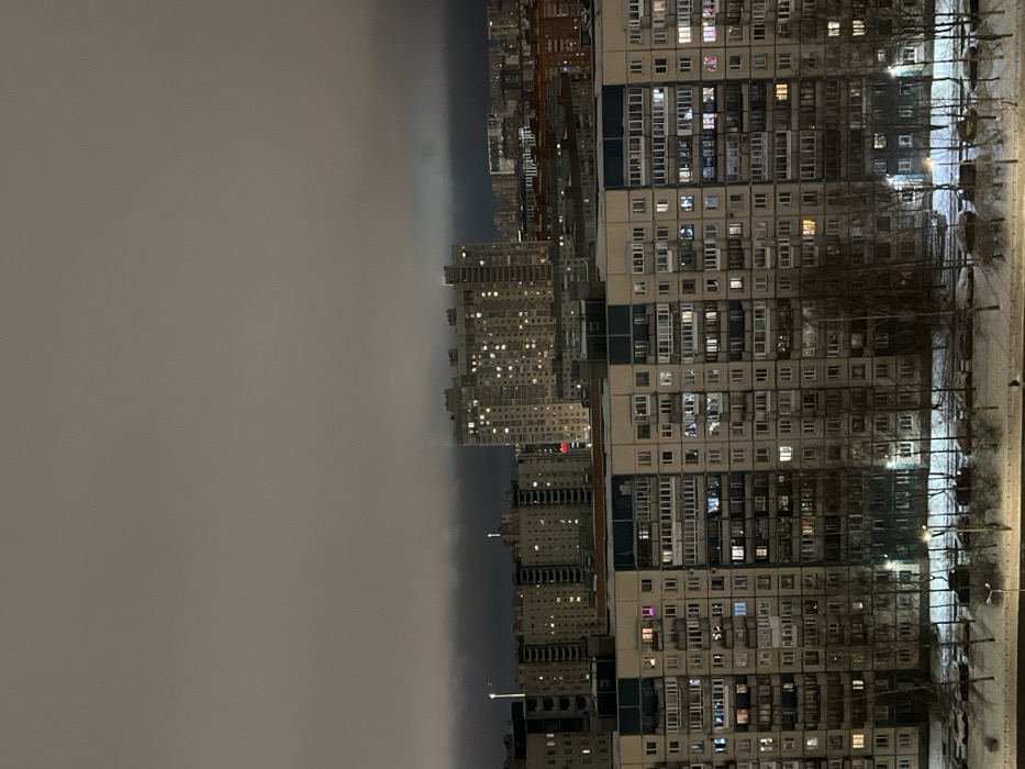 Rows of densely packed high-rise apartment buildings are seen at night, windows illuminated. To the left, a thick gray fog obscures the view. On the right side, snow-covered ground and bare trees line the street. The buildings extend far into the distance, their repetitive window patterns emphasizing the urban density. The image portrays a stark contrast between the light of the city and the darkness of the overcast night.