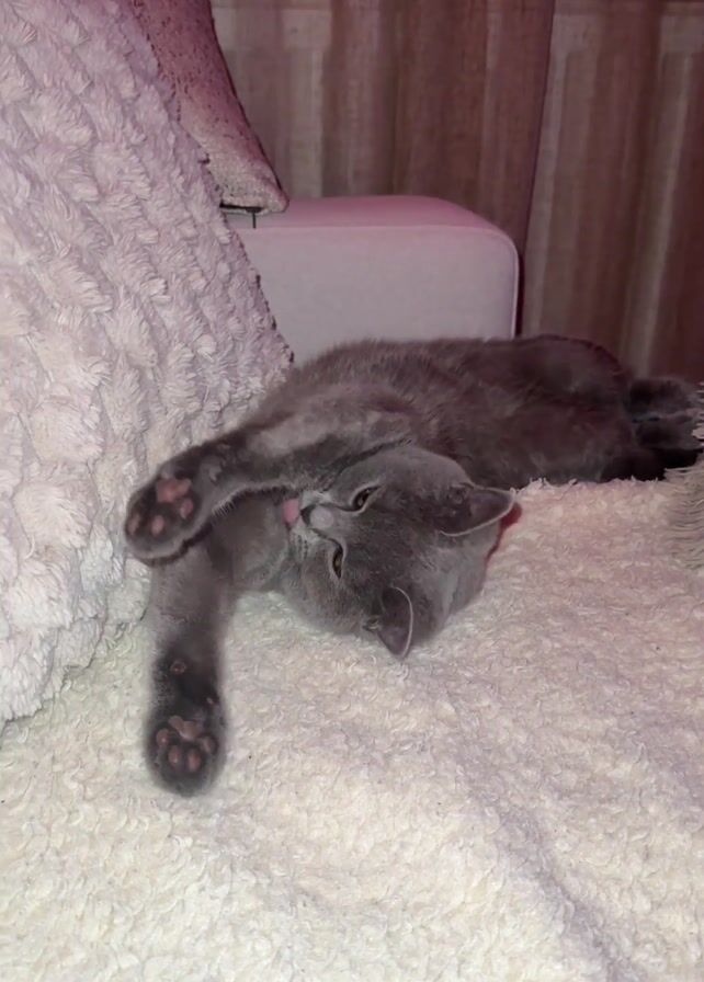 A gray cat lies on a white shag blanket. The cat is on its back with its front paws extended towards the camera. The cat has amber eyes. The blanket is next to a white chair and a fluffy pillow. Background curtains are drawn.