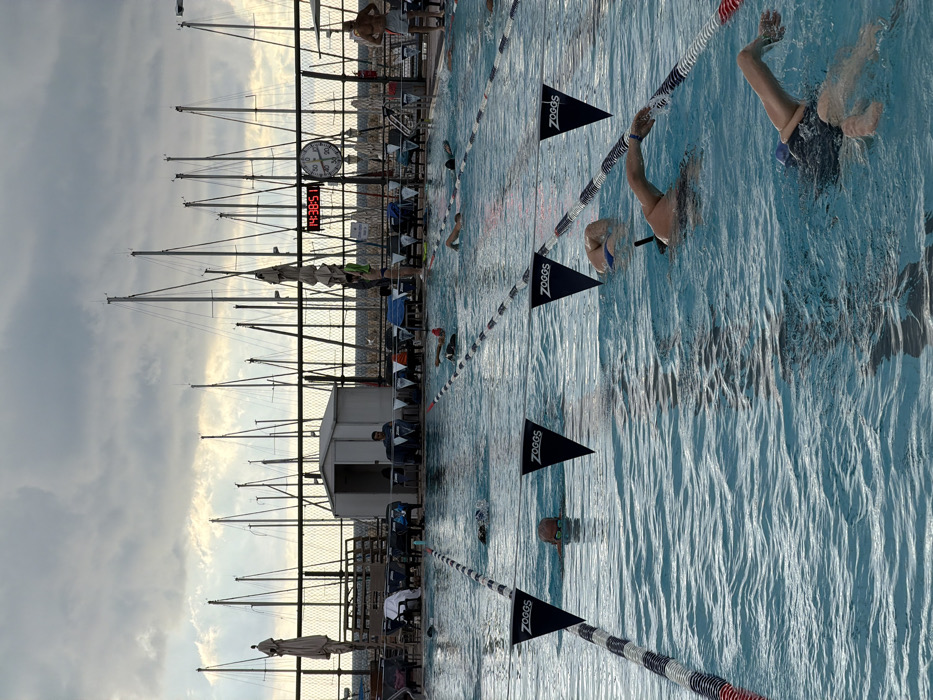 The image depicts an outdoor swimming pool facility situated at the Tel Aviv Marina in Tel-Aviv, Israel. The foreground shows a multi-lane swimming pool with blue, rippled water. Lane dividers are present, featuring black triangular flags with the "ZOGGS" logo. At least five individuals are actively swimming in various lanes. One swimmer in the immediate foreground, to the right, is performing a stroke while wearing a snorkel. Another swimmer further back, to the left, has goggles and is facing forward. Beyond the pool, a paved deck area is visible, partially furnished with beige closed parasols and lounge chairs. A small, white, shed-like structure with an open doorway is positioned centrally on this deck. To the right of the shed, a person is seated on a chair, facing the pool. A tall chain-link fence, topped with a metal rail, separates the pool area from the background. Behind this fence, numerous masts of sailboats are prominently silhouetted against a cloudy, overcast sky, confirming the marina setting. Mounted on the fence, to the right of the shed, are a red digital clock displaying "14:38:51" and a large circular analog clock. A shirtless male stands at the far-right edge of the pool deck. The overall lighting suggests an overcast daytime environment.