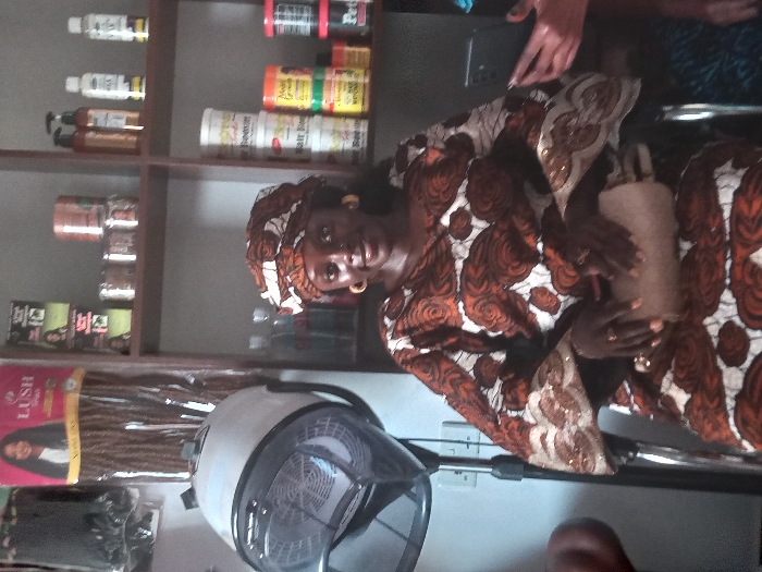 The image depicts an indoor scene in what appears to be a hair salon or beauty supply shop in Sabon Tasha, Nigeria