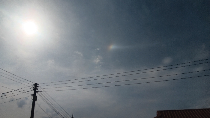 This image captures a wide-angle outdoor sky view during daytime in the city of Jos, Nigeria. The sun, appearing as an overexposed bright white orb, dominates the upper left quadrant of the frame, partially obscured by thin clouds. To the right of the sun, approximately centered horizontally in the upper-mid section of the sky, a distinct atmospheric optical phenomenon, exhibiting a segment of rainbow-like spectral colors, is visible against the blue-grey sky. Scattered white and grey clouds are distributed throughout the sky. In the lower left quadrant, a dark utility pole, equipped with multiple insulators and crossarms, rises vertically into the frame. Several dark utility wires extend horizontally across the mid-ground from the pole towards the right side of the frame. The reddish-brown corrugated roofline of a building is partially visible along the bottom right edge of the image. No individuals are depicted.