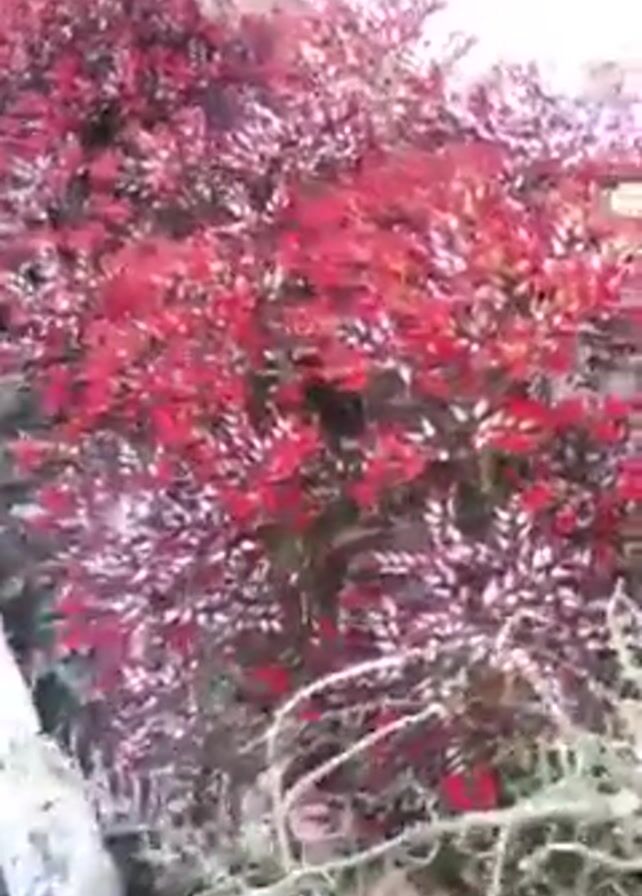 close-up view of a plant with red and purple flowers. The camera moves slightly, providing different angles of the plant. The background is blurry, but it appears to be an outdoor setting with a wall visible in the distance.