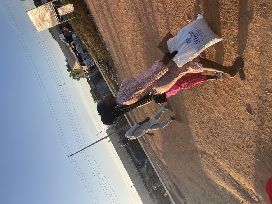The image depicts a late afternoon or early morning scene in Muchiya, Nigeria, under a clear, light blue sky with warm, low-angle sunlight. The foreground is dominated by a reddish-brown dirt road or path. In the mid-ground right, a woman with dark braided hair, wearing a long-sleeved, light-colored patterned dress, walks towards the viewer's right. She holds a white plastic bag, labeled "Teema's Saches," and a brown rectangular object in her left hand. A young child in a bright pink dress walks closely beside her, partially obscured. To the mid-ground left, a man wearing a light-colored traditional outfit and cap walks away from the camera. Overhead utility lines and a wooden pole traverse the frame horizontally. In the background right, several structures with corrugated metal roofs and tarps are visible, along with a vertical billboard-style sign displaying "DUNIA" and a graphic. In the background left, a long, light-colored concrete wall or structure is present, with piles of dark material or debris behind it. Sparse, dry-looking vegetation lines the right edge of the path.