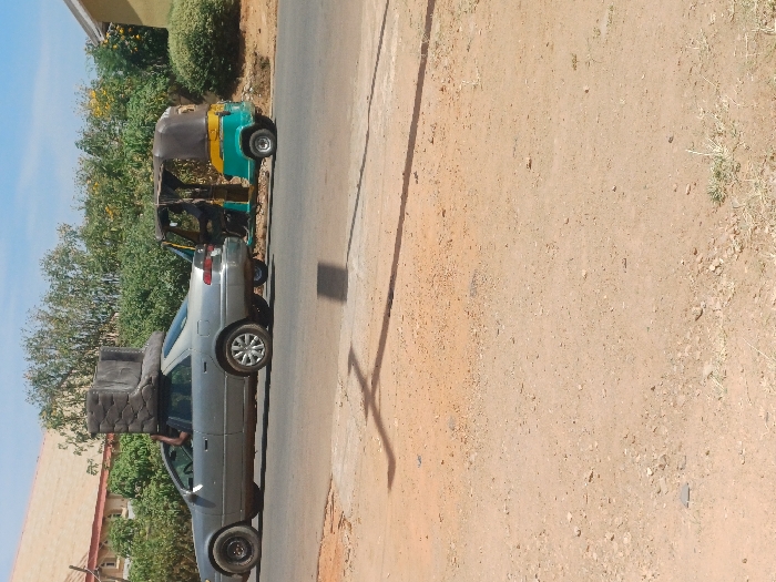 This image depicts a daytime street scene in Jos, Nigeria. A silver four-door sedan, specifically a Toyota Camry, is shown traveling on a paved road, moving right. A dark grey upholstered armchair is secured on its roof. An individual's arm is visible extending from the driver's side window, resting near the roof. Trailing the sedan is a green and yellow motorized three-wheeled rickshaw, commonly known as a keke Napep, also moving right, with its driver visible inside. The foreground consists of reddish-brown dirt, displaying shadows from an unseen overhead structure. The background features dense green foliage, including trees with yellow blossoms, and partial views of light-colored buildings with distinct rooflines, all under a clear sky.