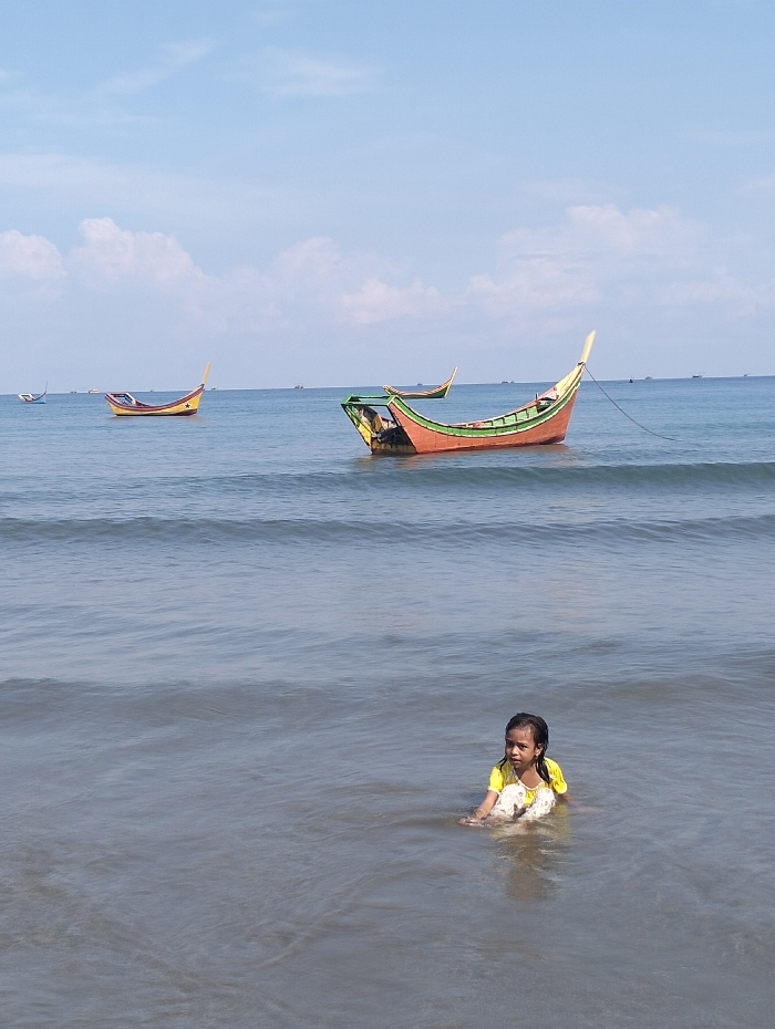 A young child sits in the ocean water near a beach. They wear a yellow and white patterned shirt. Two colorful, narrow boats with tall curved ends are in the water behind the child. The boats are a mix of red, green, and yellow. The sky is blue with a few white clouds. The water is calm with small waves. Several other small boats are visible in the distance.