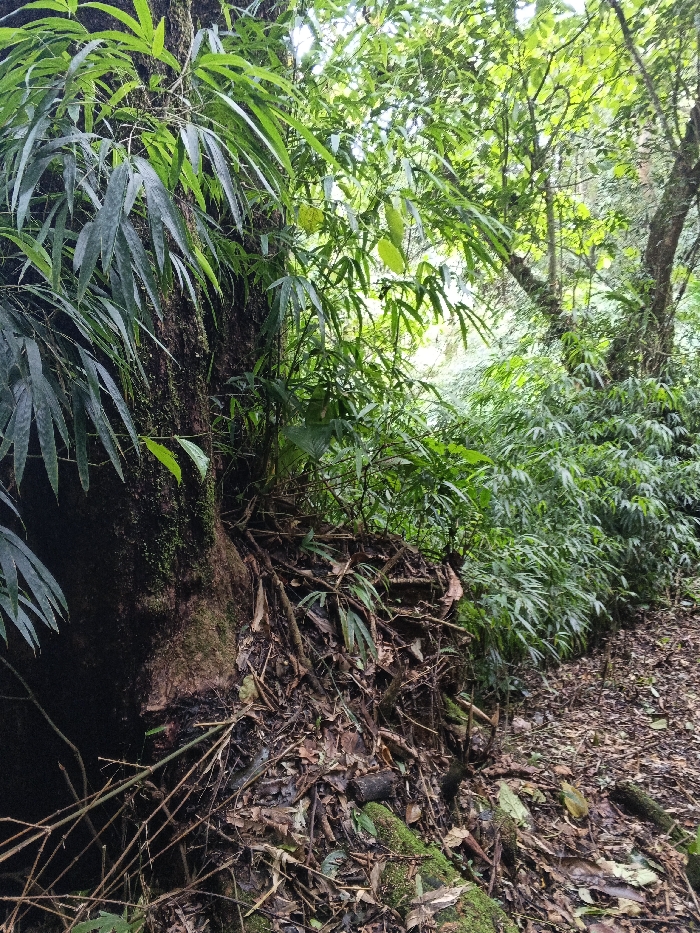 The scene depicts a dense forested area at Bangalum Bridge, Papua New Guinea. In the left foreground, a large tree trunk, dark brown and partially covered with moss and small green plants with elongated leaves, rises vertically. Adjacent to its base, a mound of organic debris comprising fallen leaves, twigs, and soil is visible. To the right of this, a thick growth of vibrant green foliage, appearing to be a species with numerous narrow, pointed leaves, forms a dense wall of vegetation extending into the mid-ground. The ground surface in the lower right quarter of the image is covered with a layer of leaf litter, small branches, and patches of moss-covered earth. The background reveals more trees and dappled sunlight filtering through the canopy, indicating a deeply wooded environment. No individuals, animals, or human-made structures are present in the frame.