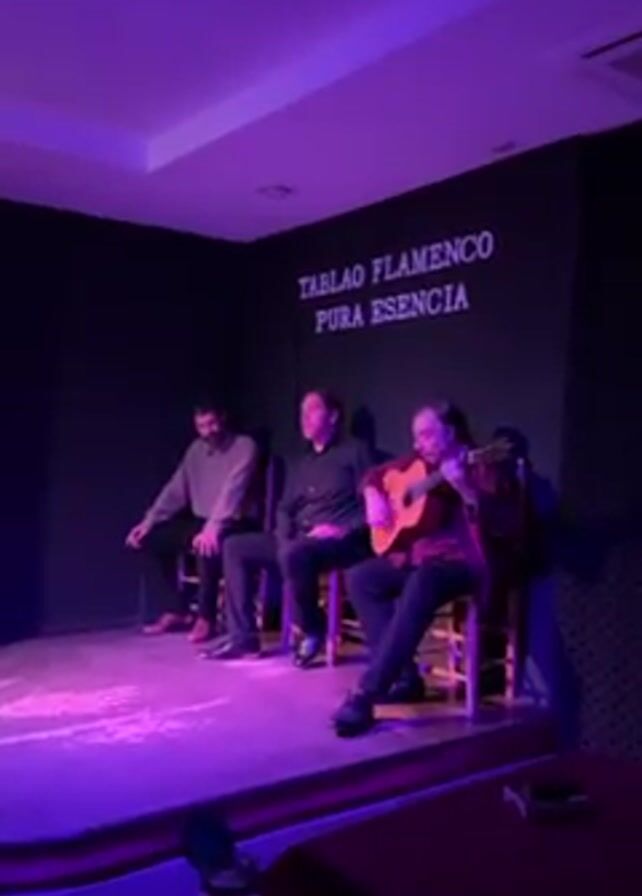 Three men are on a low stage, seated in chairs, under purple lighting. The man on the right is playing a flamenco guitar. The middle man is singing. The man on the left is sitting quietly. Behind them, a wall reads "TABLAO FLAMENCO PURA ESENCIA." The stage and wall are dark, contrasting with the bright letters and lighting. The scene is captured from a low angle, possibly from a table in the audience. A water bottle and glass are visible in the foreground.