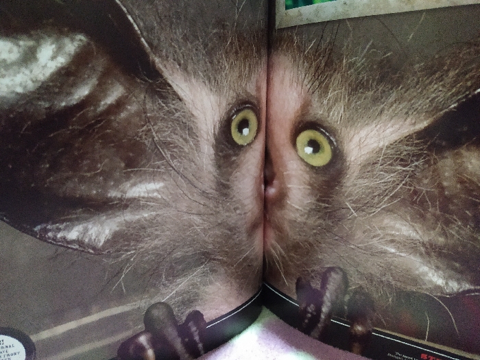 The image captures an open book, identified within the city of Harasta, Syria, featuring a large, close-up photograph of an animal's face. The subject animal, likely a primate, has prominent, large, circular yellowish-green eyes and dense, light brown-grey fur. Its face is split down the center by the book's spine, with a portion of its nose visible at the seam. Dark, elongated digits are visible at the lower edge of the photograph. The background within the printed image is dark and blurred. The book itself rests on a soft, light-colored, possibly pink or white, patterned textile surface.