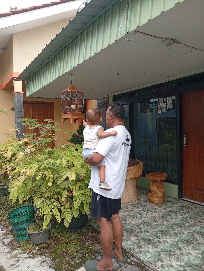 A man holds a baby in his arms outside a house. The baby points towards a birdcage hanging under the porch. Plants flank the left side of the frame. A wooden table and a wooden stool sit near the house's door. The man wears a white shirt, black shorts, and slides. The baby is in a light-colored shirt and shorts. The house is light beige with a dark-colored door and porch trim.